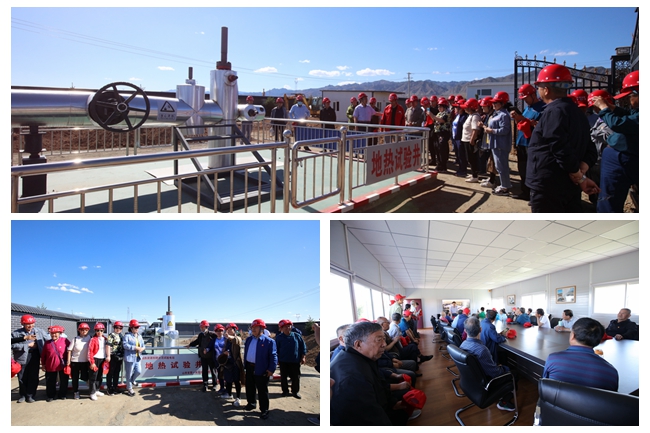 在高温地热资源开发利用科研示范基地,一下车,项目组就准备了热乎乎的绿豆汤,让老同志们感受到了热情周到的关怀。随后,在项目相关负责人的带领下,实地参观了1#发电机组、2#发电机组、水处理车间、集控室大同盆地重点地区深部高温地热资源详查-DR1勘探孔现场,了解了发电工艺试验电站运行和详查项目进展情况并召开了现场座谈会,党委书记郭红党详细介绍了地热资源勘查项目初期、现状及未来发展前景,着重强调了党史学习教育和改革稳定工作要求,共同观看了《牢记嘱托蹚新路 初见成效交答卷》试验电站建设纪实