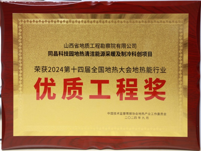 9月20日,以“开拓创新 拥抱地热新时代”为主题的2024第十四届全国地热大会在山东济南召开。地勘院有限公司同昌科技园地热清洁能源采暖及制冷科创项目荣获地热能行业“优质工程奖”。